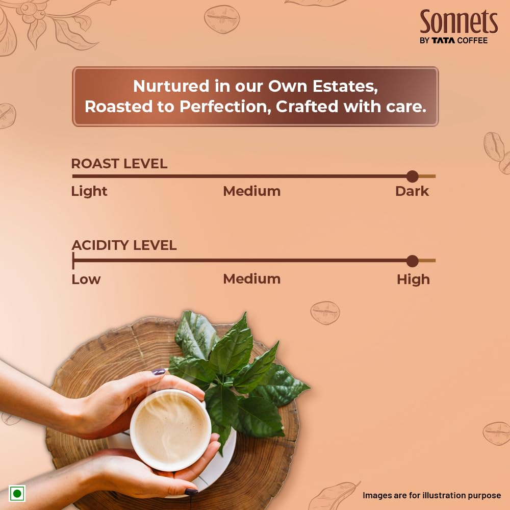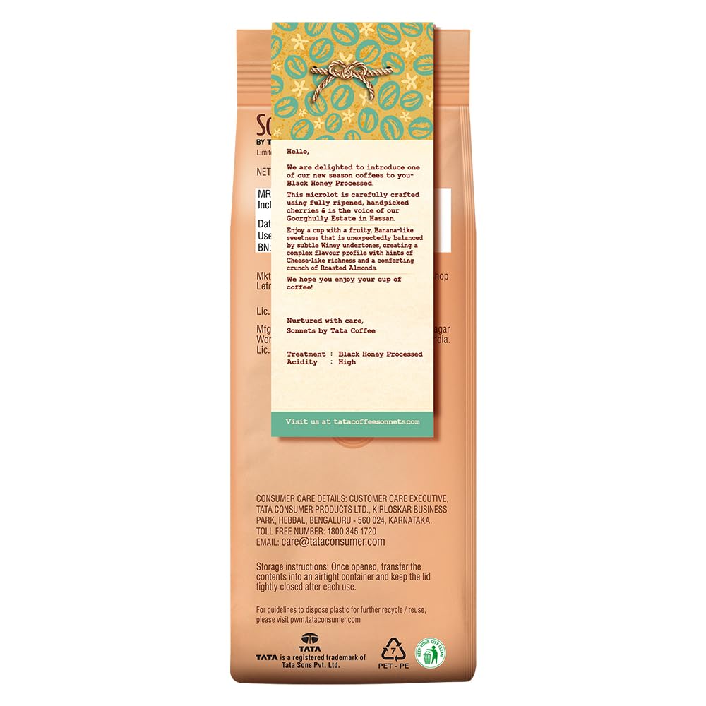 Black Honey DARK COFFEE: Introducing one of our new season coffees to you – Sonnets by Tata Coffee Black Honey Dark Roast coffee DARK ROAST WHOLE BEAN COFFEE: Sonnets by Tata Coffee brings you rich and aromatic Dark Roast whole bean coffee from the Goorghully Estate FLAVOURFUL TASTING NOTES: Enjoy the delightful tasting notes of Banana & Roasted Almonds GOORGHULLY ESTATE: This microlot is carefully crafted using fully ripened, handpicked cherries from our Goorghully Estate in Hassan ALSO TRY: Goorghully Estate Whole Bean Dark Roast Coffee, Jumboor Estate Dark Roast Filter Coffee, Jumboor Estate Medium French Press COMMONLY SEARCHED TOPICS: Tata Coffee, tata sonnets, sonnets Tata Coffee, sonnets coffee, sonnets whole bean coffee, sonnets medium roast coffee, tata sonnets coffee