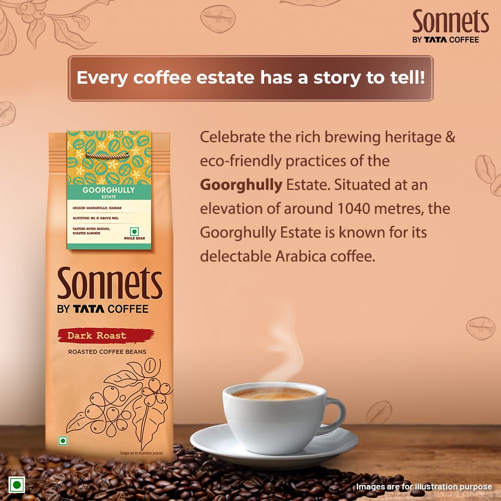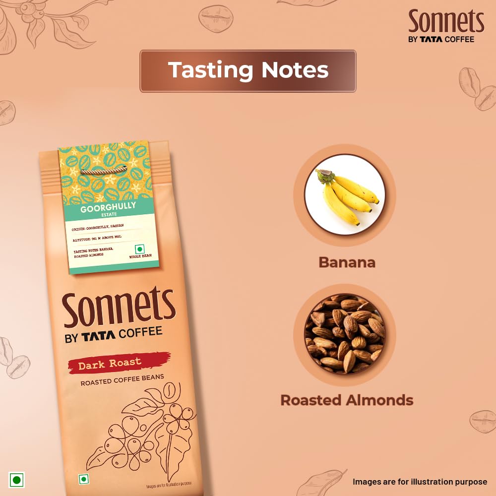 Sonnets by Tata Coffee, Goorghully Estate Dark Roast Whole Bean Coffee with Tasting Notes of Banana & Roasted Almonds, Arabica Coffee, Single-Origin Coffee, 250 g