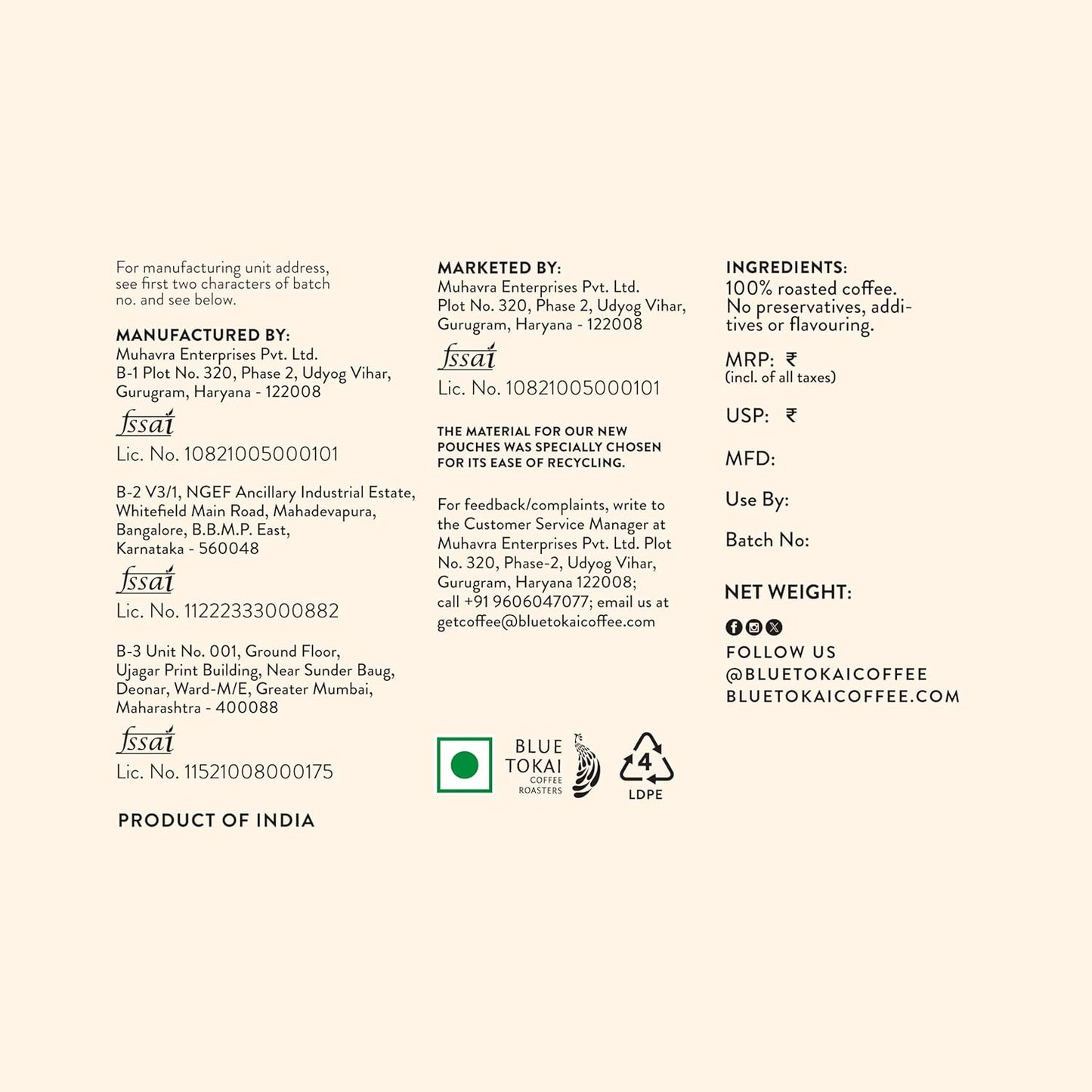 ABOUT BLUE TOKAI COFFEE: Blue Tokai brings freshly roasted and ground coffee from India’s best farms to your cup. Roasted with precision and care, each coffee boasts unique flavours. SERVING: Each pack contains 250 gm of coffee and can brew up to 15 cups. Vienna French Roast is one of our most popular dark roasts. VARITETY: You get to choose from a variety of flavour profiles, ranging from bold and bitter to balanced, chocolatey and nutty as well as fruity and punchy. WITH/WITHOUT MILK: Take your pick from our varied range of light, medium, medium dark and dark roasts. We recommend light roasts without milk, and medium and dark roasts with milk. Freshly Roasted Coffee, 100% Arabica Coffee Beans, Roasted to Order and Ground to suit your brewing method Roast Level: Medium Dark (In to 2nd crack) Cupping notes: Cocoa, Fruity, Toffee Choose beans or the appropriate grind for your particular brewing method" Recommended Brewing Methods - French Press, Inverted Aeropress, Moka Pot, Coffee Filter Roast Level - Medium Dark