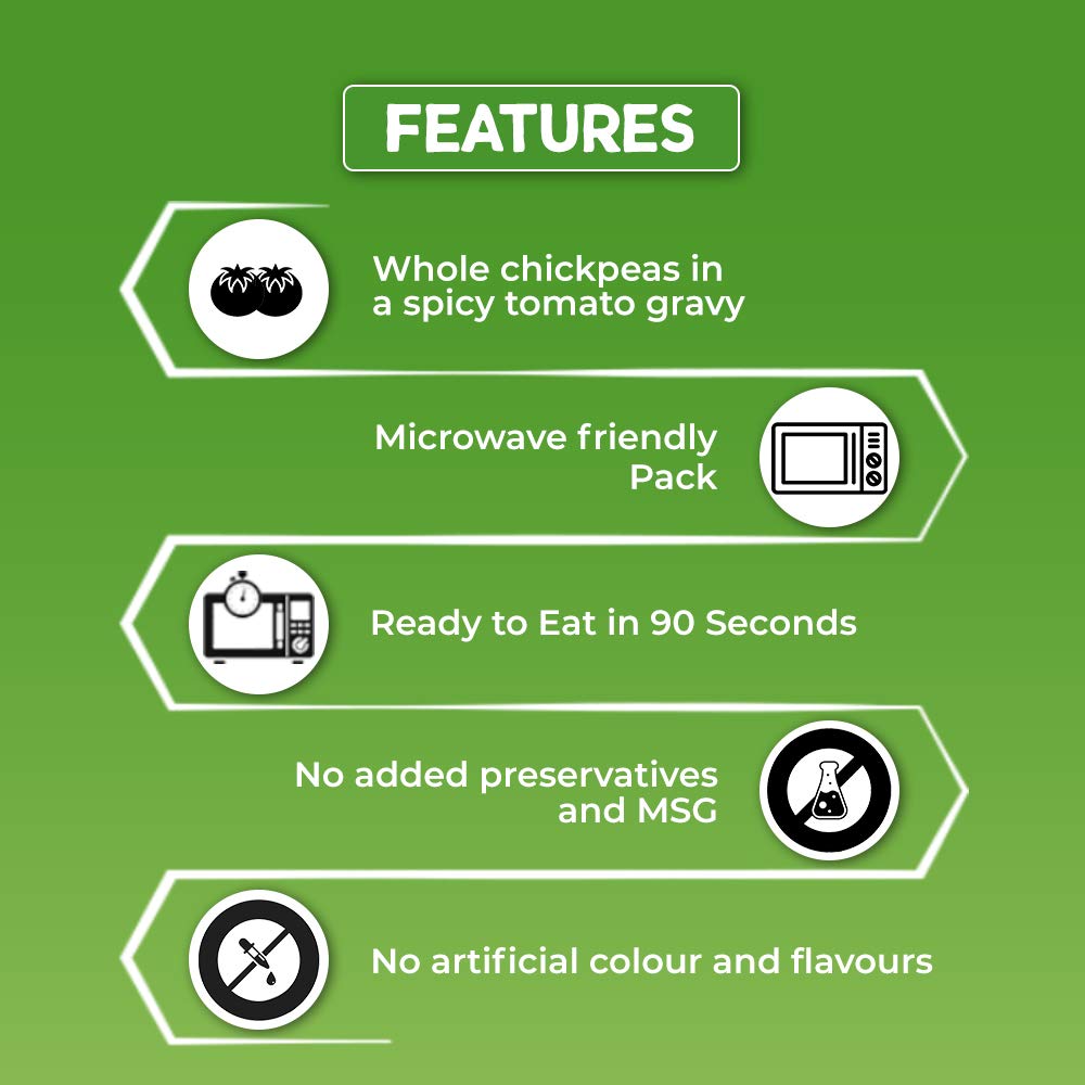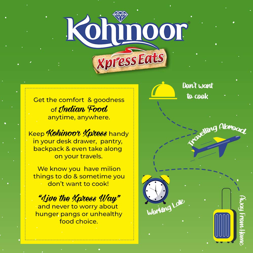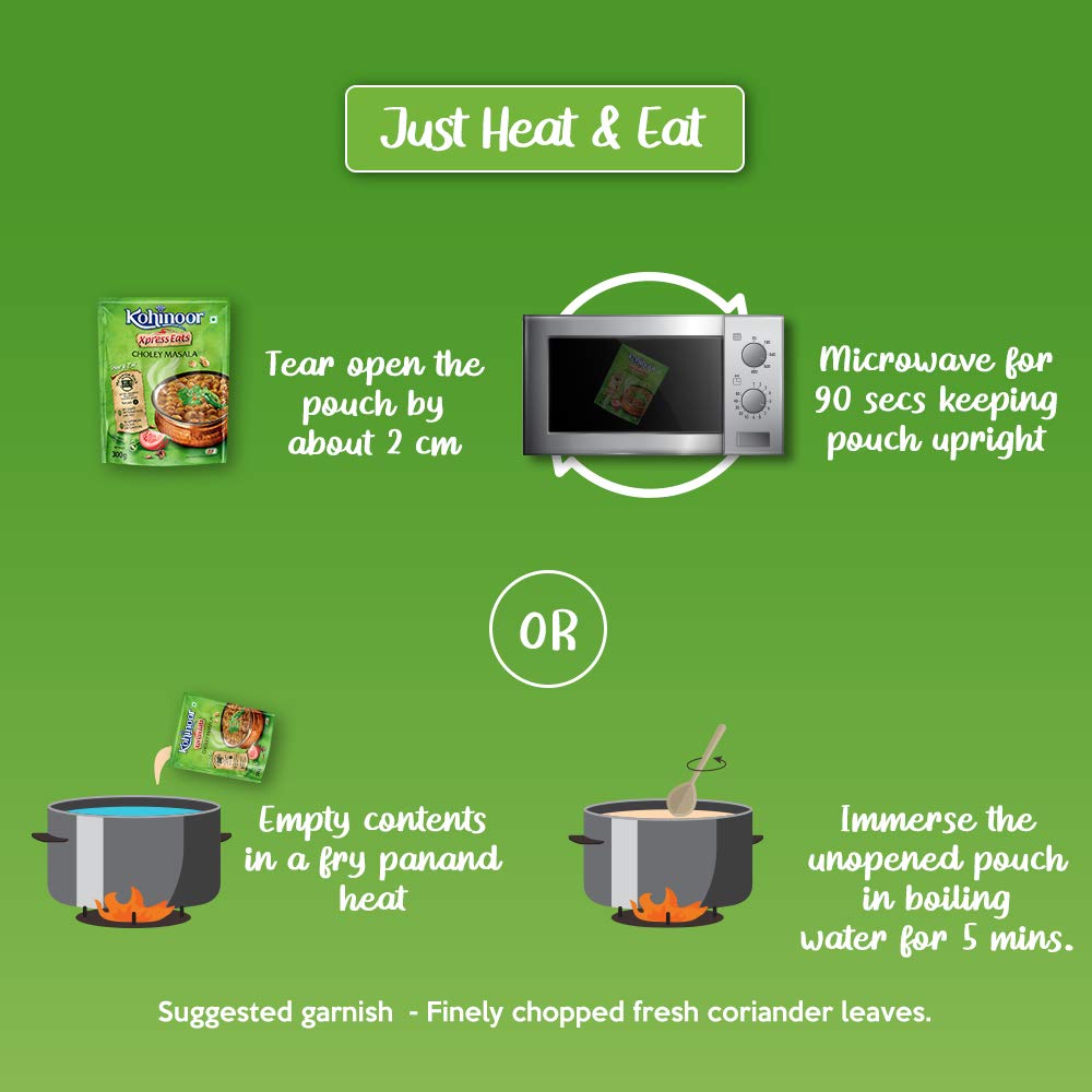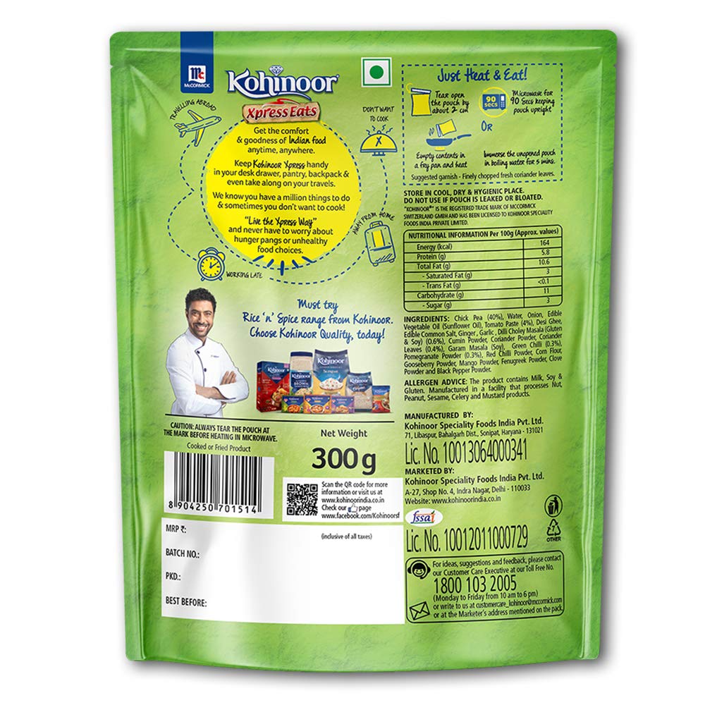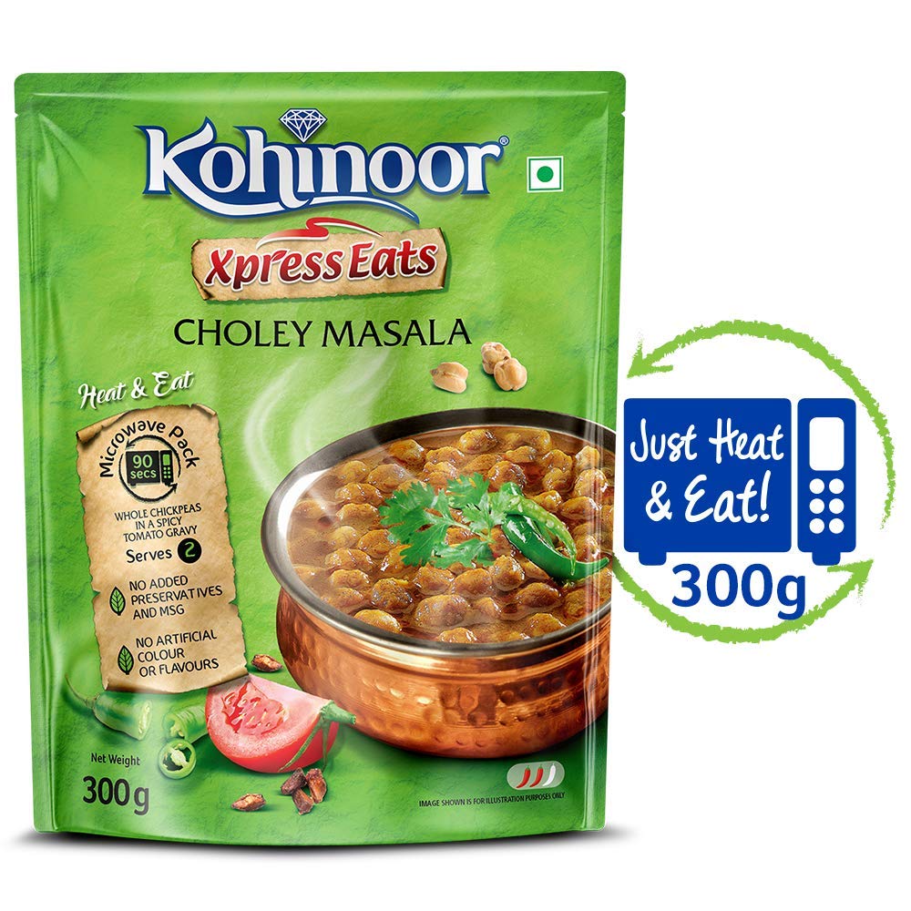 [COMFORT OF INDIAN FOOD]: Get the comfort and goodness of Indian food anytime, anywhere with Kohinoor Ready to Eat meal [PURANI DILLI KE CHOLEY]: Experience the authentic taste of purani dilli ke choley with Kohinoor Xpress Eats Choley Masala [JUST HEAT & EAT]: Slow cooked chickpeas braised in coriander scented onion tomato gravy, with a tang of pomegranate [READY IN 90 SECONDS]: Microwave friendly ready to eat pack to feast on anywhere [SERVES 2 PEOPLE]: 1 pack serves 2 people [NO ADDED PRESERVATIVES]: This pack contains no artificial colour or flavours and no added preservatives and MSG [ALSO, TRY]: Kohinoor Authentic Ready to Eat pack also available in rajma masala, dal makhani, palak paneer and other variants [COMMONLY SEARCHED TOPICS]: Kohinoor ready to eat, ready to eat, ready to eat meal, Kohinoor ready eat, ready to eat in pantry, ready to eat kits, ready eat meal, ready to eat meal vegetarian, paratha ready to eat