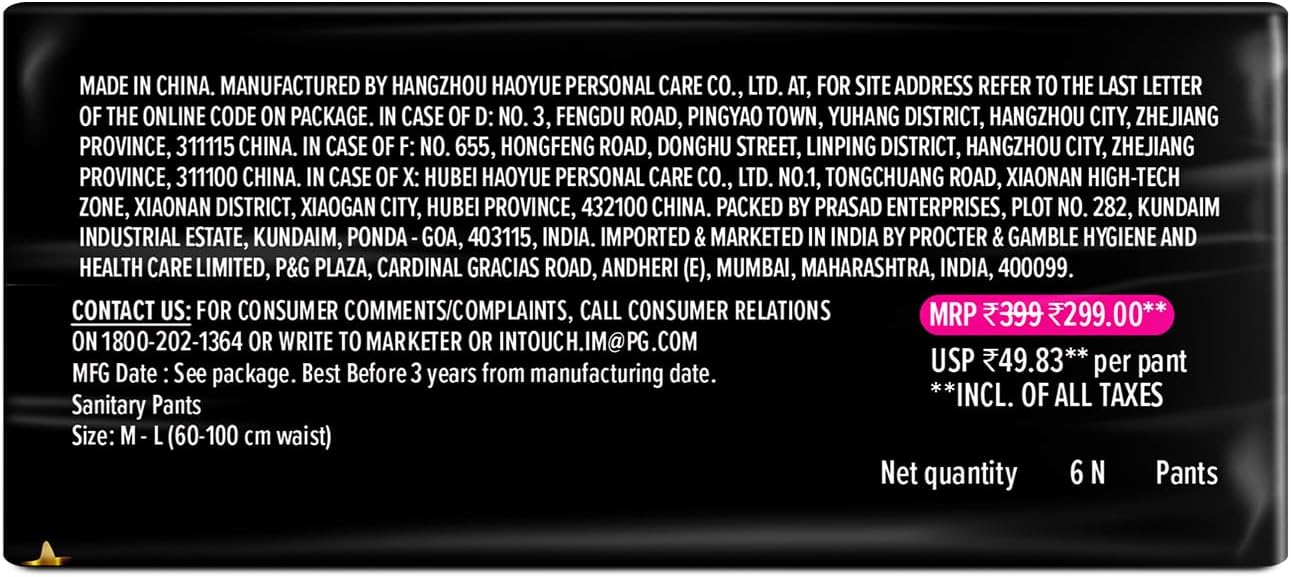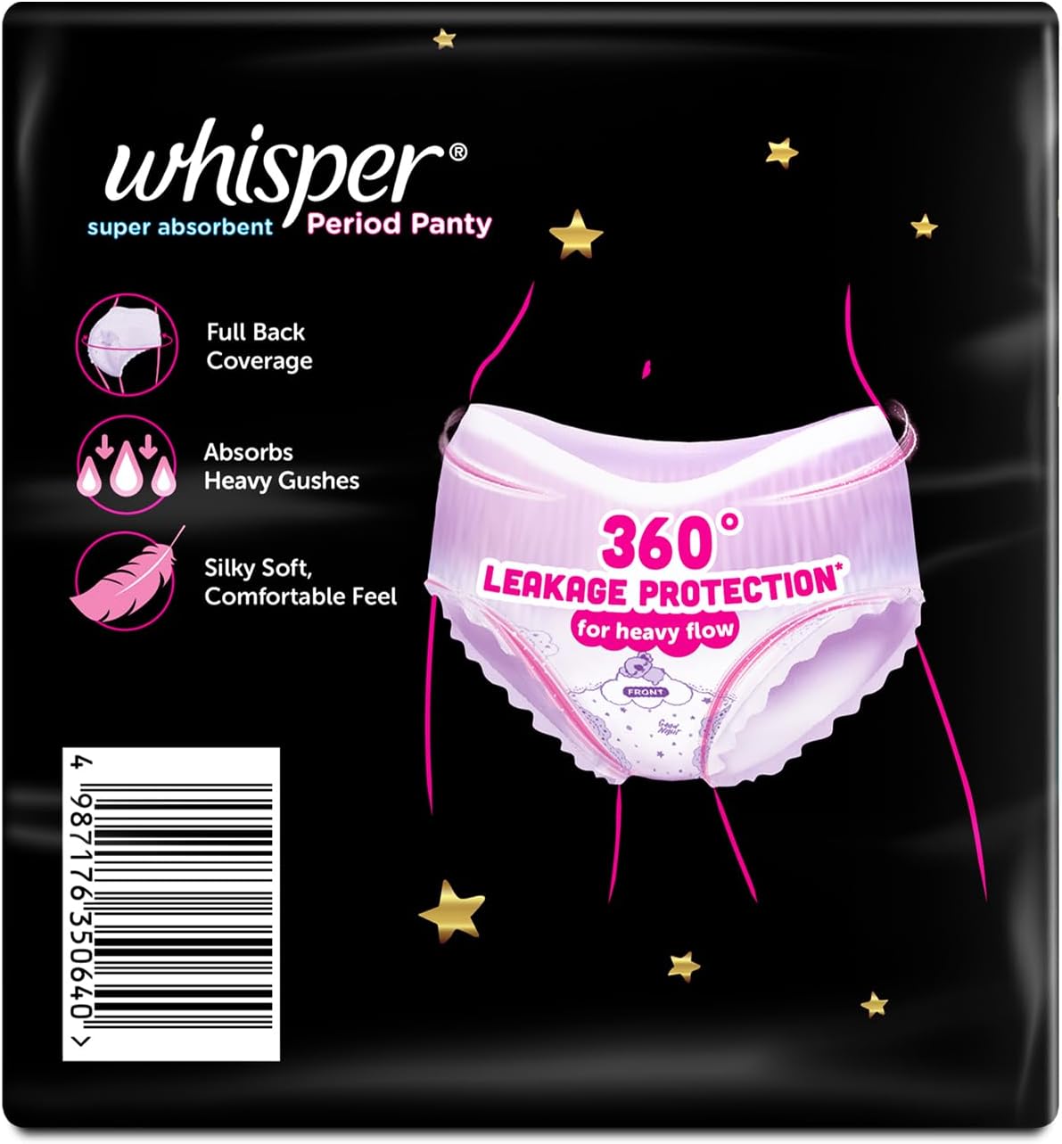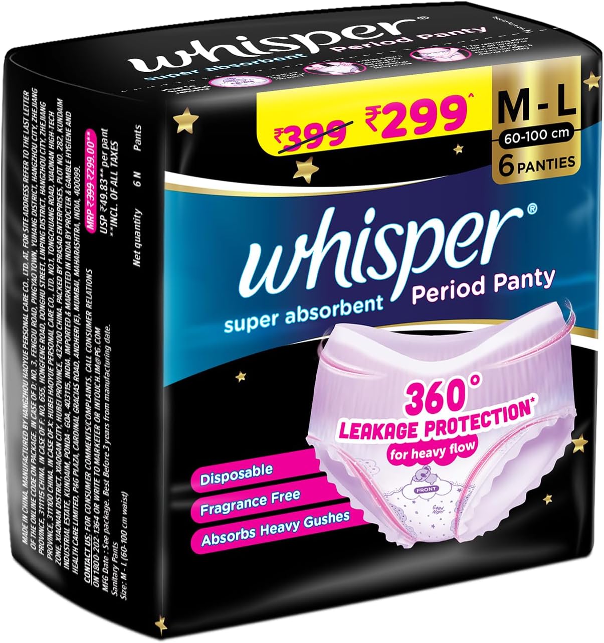 Whisper Bindazzz Night Period Panty|6 M-L Panties|upto 0% Leaks|360 degree leakage protection|Full back coverage|Suitable for Heavy Flow|Flex fit|Soft & comfortable|With disposable wrap