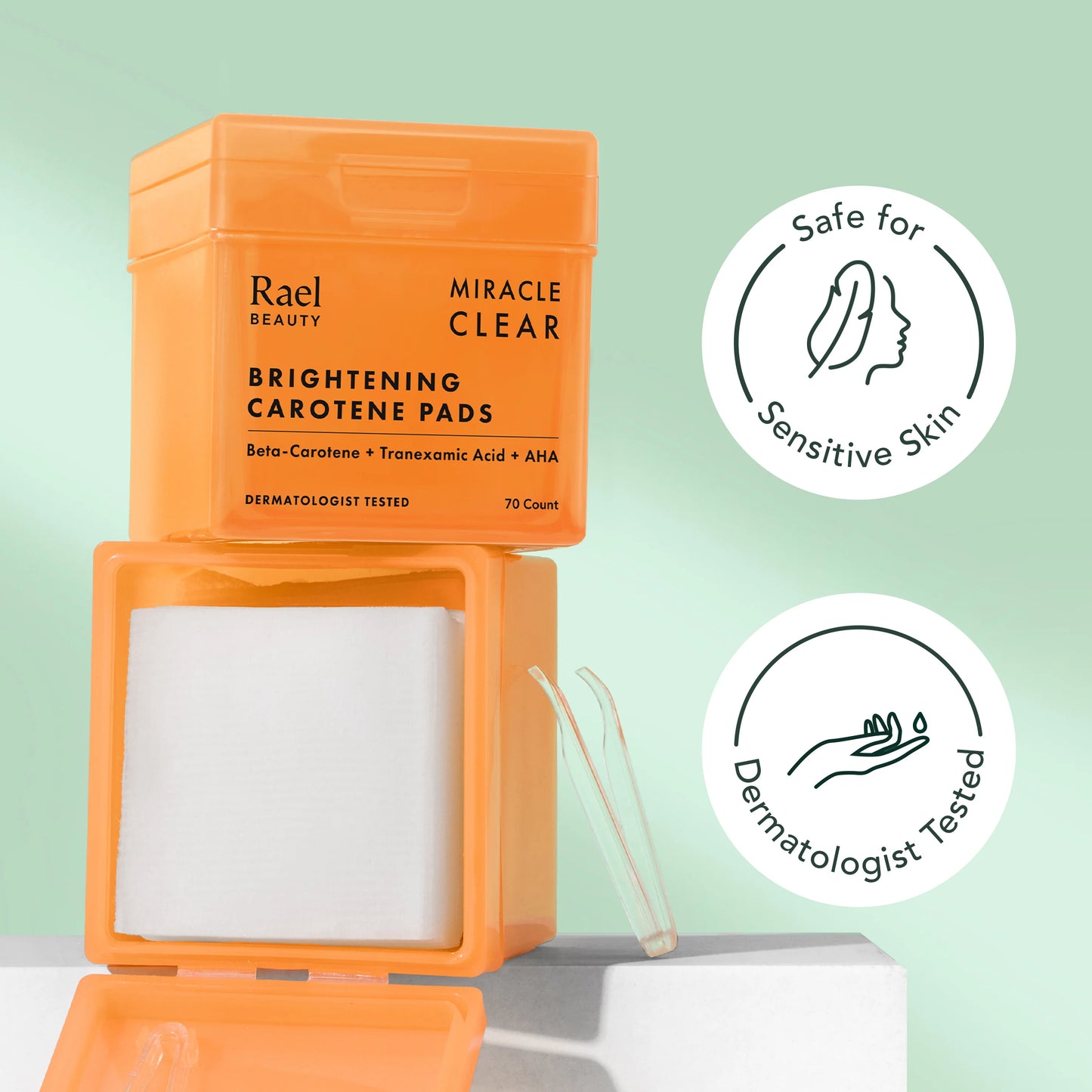These dual-purpose Brightening Carotene Pads work as both an everyday toner and a resurfacing treatment, helping to instantly brighten your skin tone. Use the gel-infused side for quick toning or apply as a sheet mask for targeted deep nourishment. Flip to the textured side for gentle exfoliation. Pre-soaked with a concentrated brightening complex, these pads are infused with Beta-Carotene to boost radiance, Tranexamic Acid to brighten and smooth skin tone, and AHA to gently exfoliate. Eight types of Hyaluronic Acid ensure ultimate hydration. Safe for daily use, even on sensitive skin.